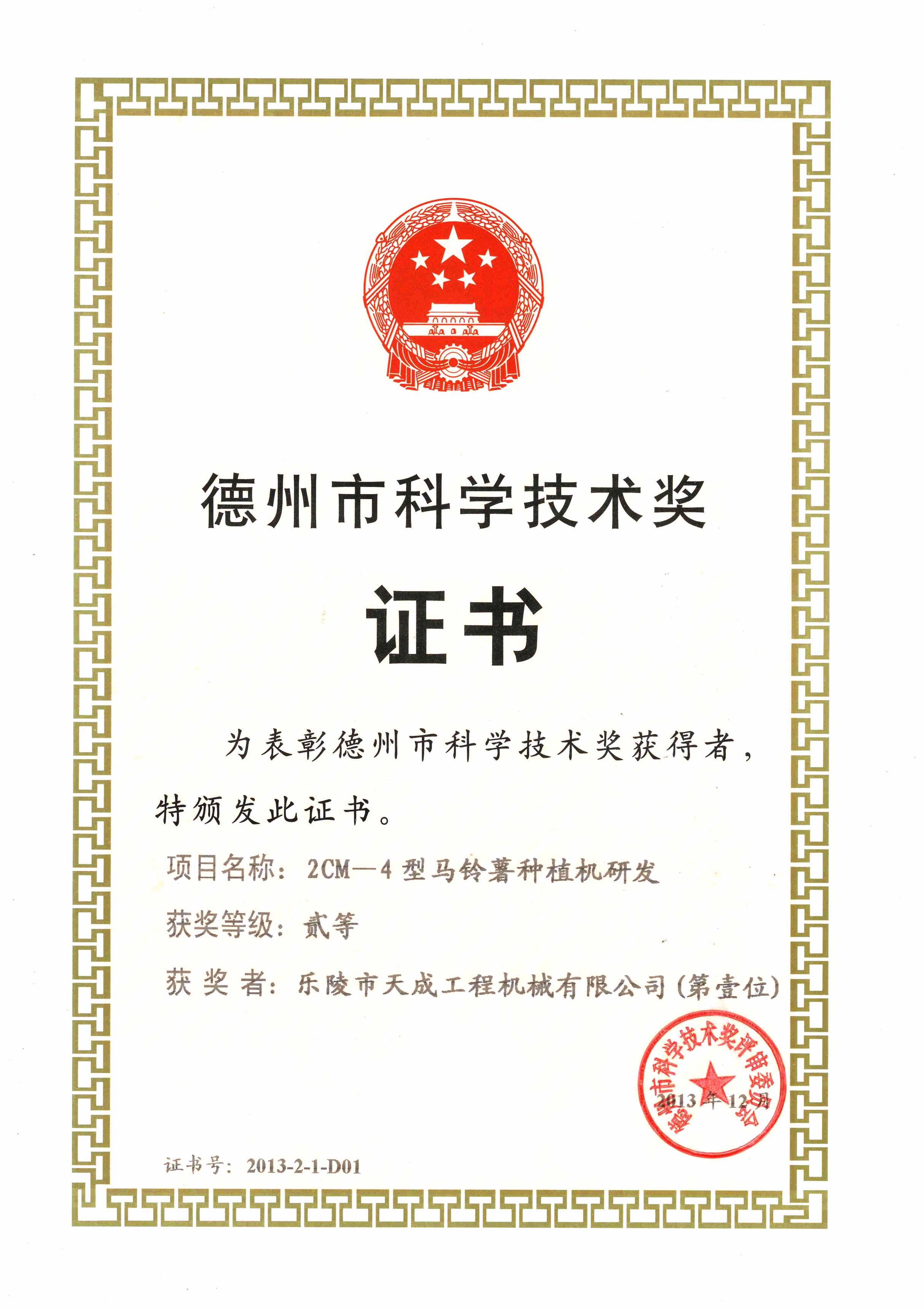 • In 2013, the new potato special planting machine production demonstration project won the Shandong Provincial Science and Technology Department results transformation funds;